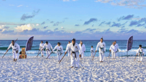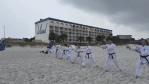 若竹館は、2025年8月29日から31日まで、フロリダ州オカルーサ島のアイランドリゾートで3日間の基礎稽古合宿を開催しました。沖縄、プエルトリコ、ロードアイランドなど遠方から14名の参加者が集まり、本部朝勇、上原清吉について学び、本部御殿手の技を体験しました。1日目は、御殿手の歴史、系譜、身体の仕組み、そして基礎技について講義が行われました。2日目は、午前5時から午前9時まで、生徒たちはビーチで稽古を行い、姿勢、歩き方、ビーチラン、基本動作、そして型を練習しました。カリキュラムは、沖縄のサンセットビーチ稽古と同じスケジュールとスタイルで行われました。午後は、基礎コースの生徒は御殿手棒の指導を受け、中級コース2年生はサイの指導を受けました。夜は、沖縄文化を味わう夕食会を開催しました。 3日目には、生徒たちは総仕上げとして、元手1、元手2、合戦手3、合戦手4、合戦棒、合戦サイを披露しました。1年目の参加者には基礎トレーニングキャンプ修了証が、2年目の参加者には中級トレーニングキャンプ修了証が授与されました。来年度のキャンプは2026年9月24日から26日に開催されますが、参加を希望する参加者は多くいます。会場の詳細や参加登録については、www.motobu-udundi.comのイベントセクションをご覧ください。